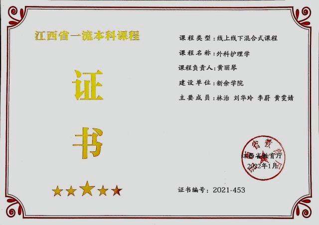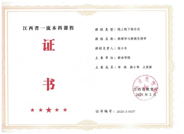 公司在pa娱乐游戏官网第一批、第二批校级一流课程中已有5门课程获准立项,分别是张小冬老师的《病理学与病理生理学》、黄丽琴老师的《外科护理学》、席微娜老师的《护理研究》、占星新老师的《医学统计学》、彭琛琛老师的《运动生理学》,其中张小冬老师的《病理学与病理生理学》、黄丽琴老师的《外科护理学》分别于2020年、2021年认定为江西省线上线下混合式一流课程。