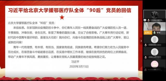 活动结尾,辅导员们组织大家集体学习了习近平给北京大学援鄂医疗队全体“90后”党员的回信。在这次抗击疫情的斗争中,以“90后”为代表的青年一代挺身而出、担当奉献,充分展现了新时代中国青年的精神风貌。总书记的回信充分肯定了广大青年在此次疫情斗争中的努力,并对青年朋友们寄予厚望,希望大家在为人民服务中茁壮成长、在艰苦奋斗中砥砺意志品质、在实践中增长工作本领,继续在救死扶伤的岗位上拼搏奋战,让青春在党和人民最需要的地方绽放绚丽之花。